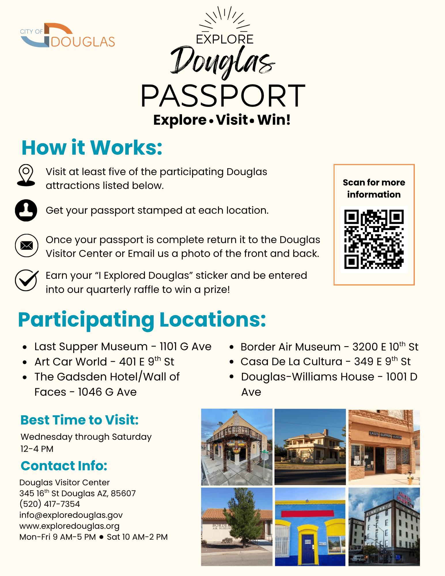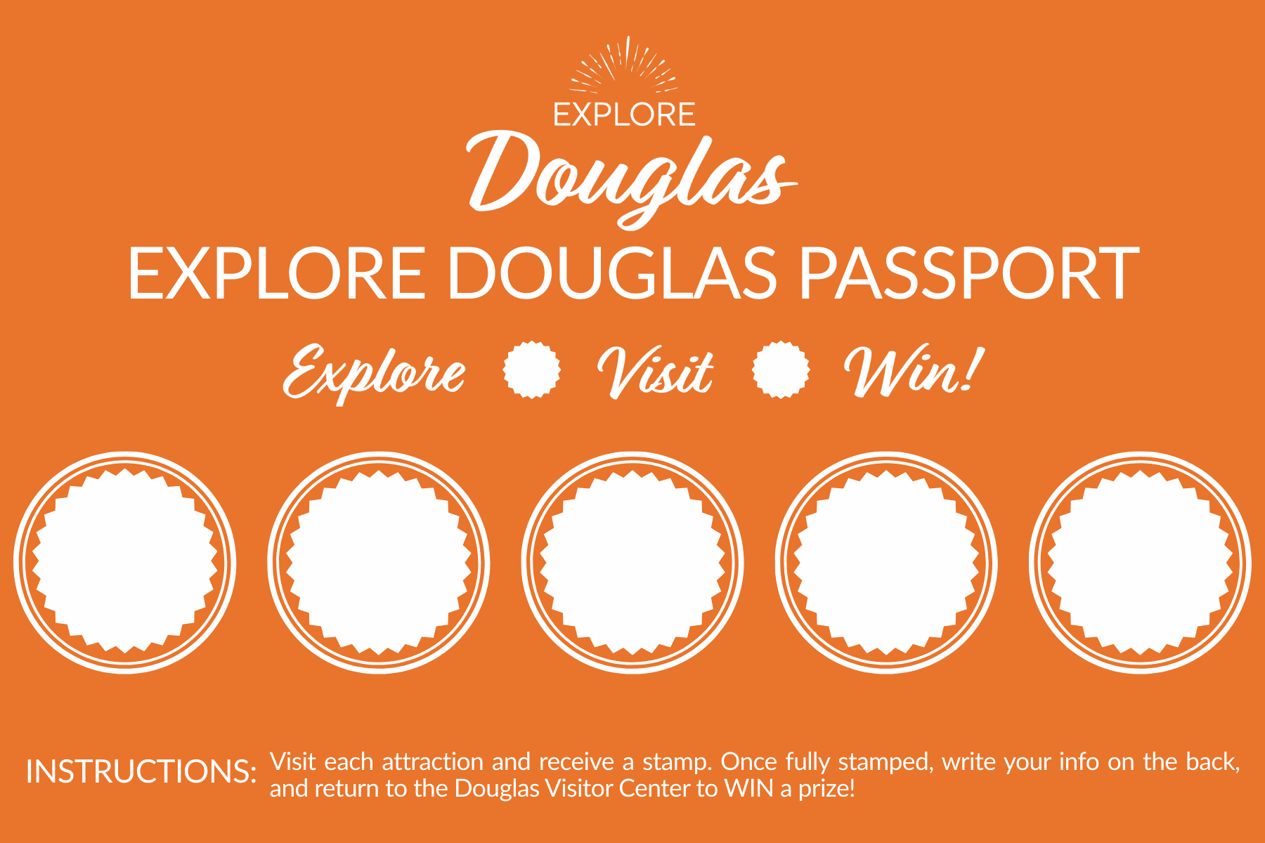 Stop by our visitor center to pick up your passport card today! Visit at least five of the following locations to receive an “I Explored Douglas” sticker and be entered into our quarterly raffle to win a prize!